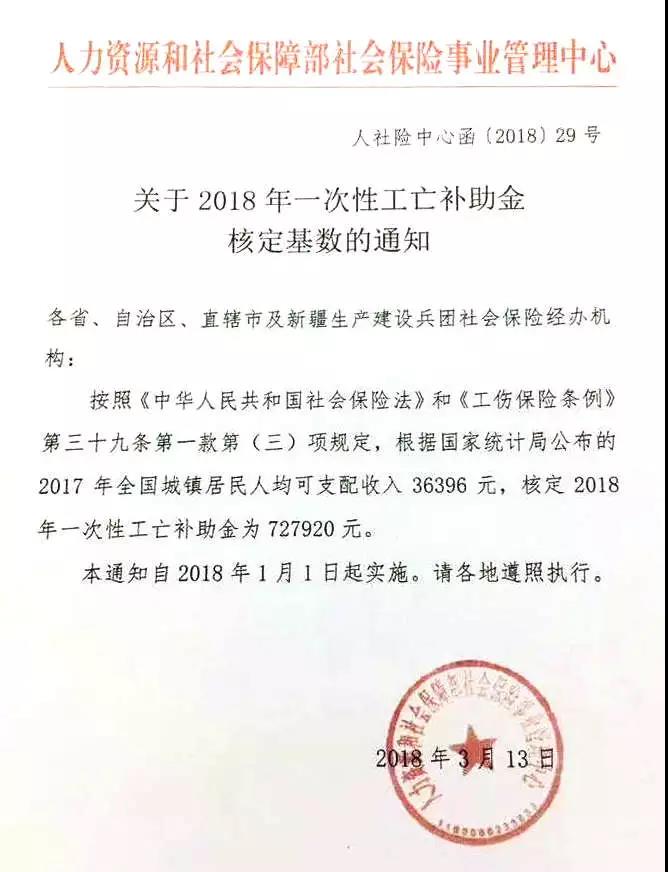 關(guān)于2018年一次性工亡補助金核定基數(shù)的通知