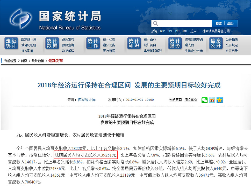 2019年1月21日上午10點(diǎn),國(guó)家統(tǒng)計(jì)局召開(kāi)國(guó)民經(jīng)濟(jì)運(yùn)行情況新聞發(fā)布會(huì),公布了以下數(shù)據(jù):2018年全年全國(guó)居民人均可支配收入28228元,2018年城鎮(zhèn)居民人均可支配收入39251元。