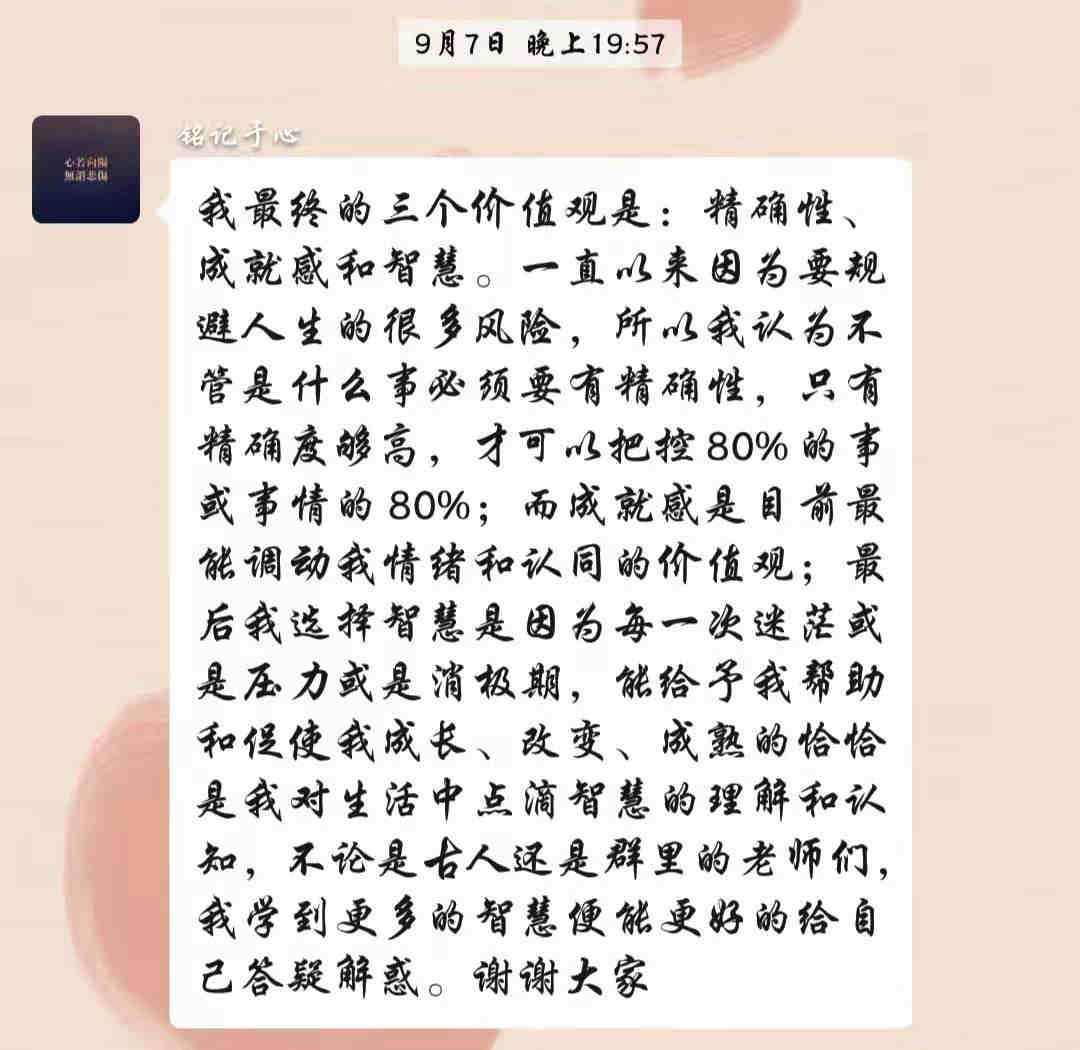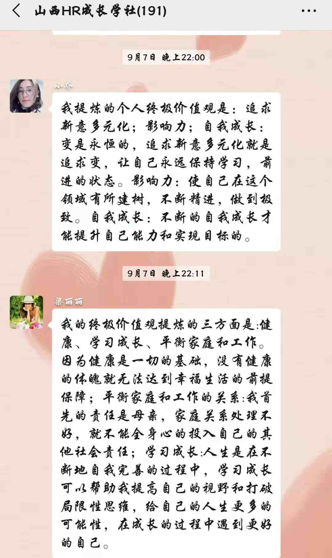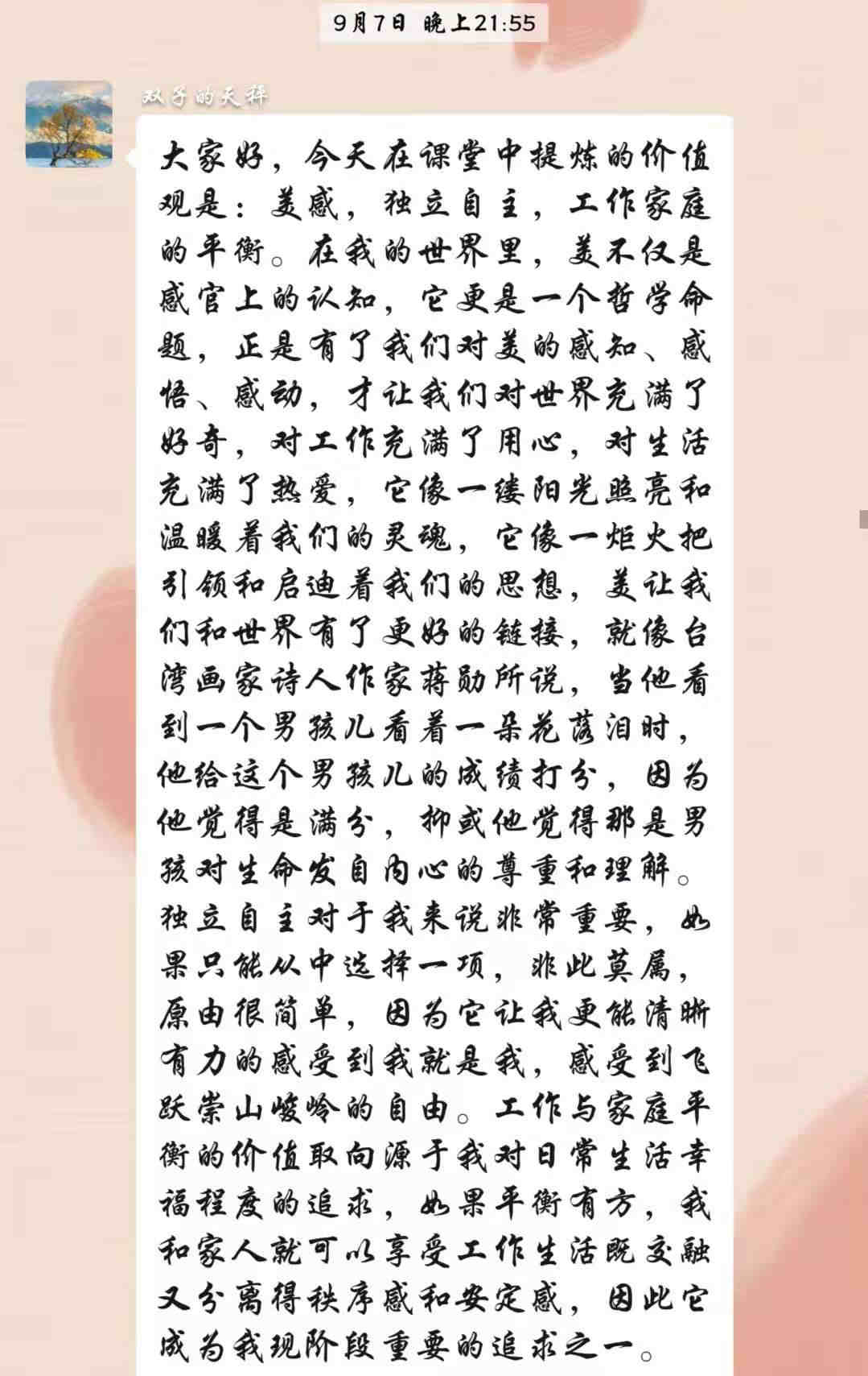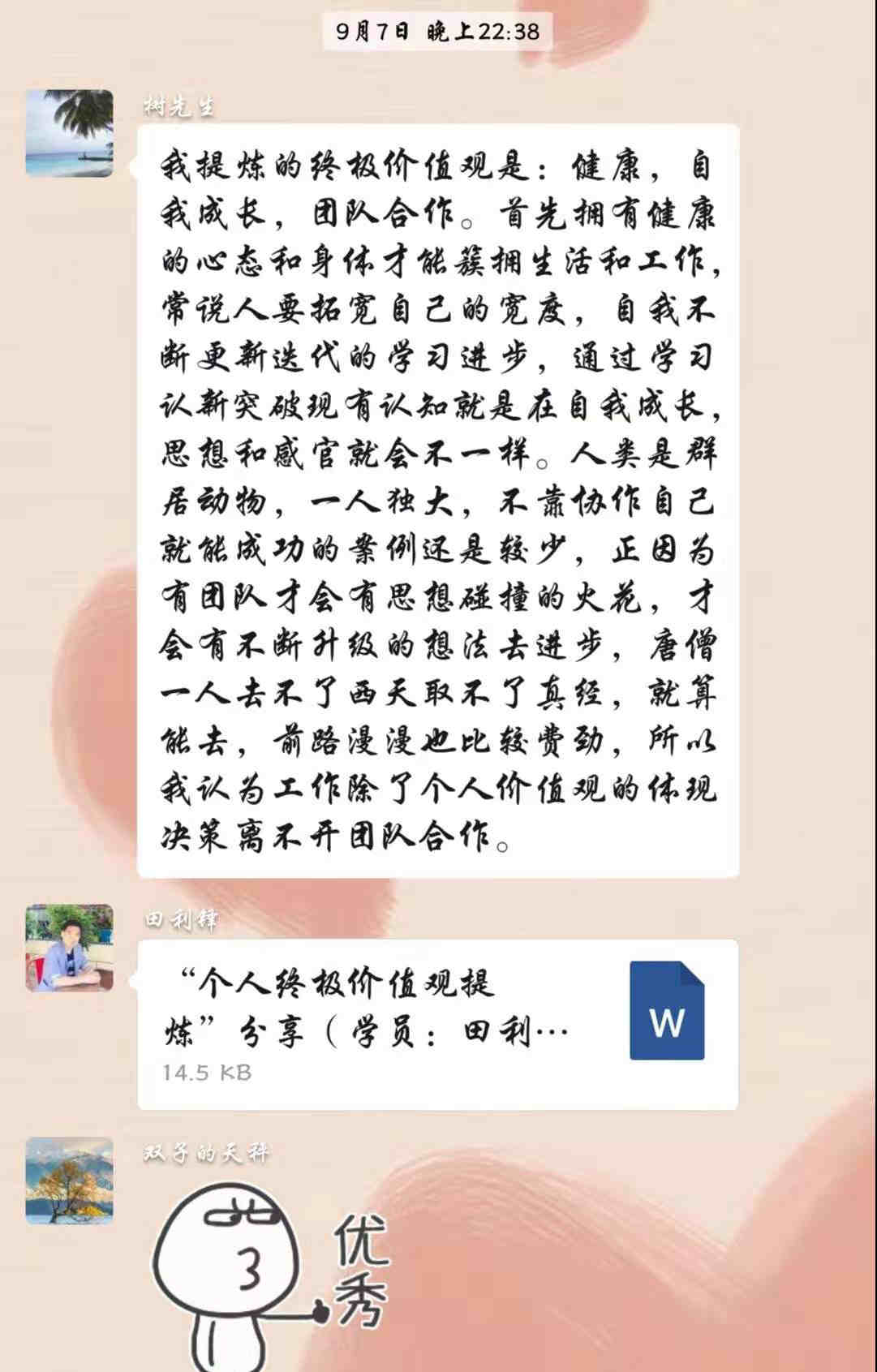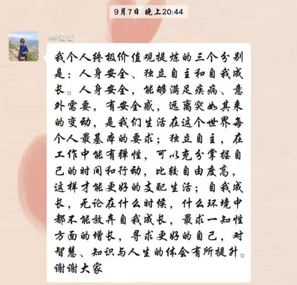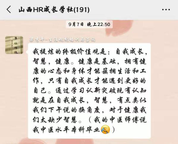 短暫的午間小憩后由明星學員杜春帶領著大家跳了一曲“蹦沙卡拉”,滿滿的激情與能量,各位學員再次滿血復活投入到了下午的課程當中。性格、興趣、勝任能力都充分了解后,怎樣才能走向職業(yè)巔峰呢?緊接著又一波測試來襲——價值觀測試,36個價值觀重視程度的選擇,8個非常重視再次層層篩選,***后每位學員都得到了自己的3個******價值觀,果然一千個人心中會有一千個哈姆雷特,大家互相分享著自己的選擇,激烈的討論著自己的******價值觀,課后依然回味無窮。