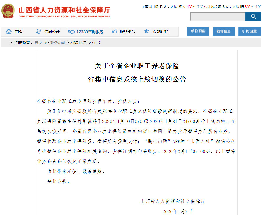 省人社廳提醒全省各企業(yè)職工養(yǎng)老保險(xiǎn)參保單位、參保人員,在系統(tǒng)切換期間,全省各級(jí)企業(yè)養(yǎng)老保險(xiǎn)經(jīng)辦機(jī)構(gòu)窗口和網(wǎng)上經(jīng)辦大廳暫停辦理所有業(yè)務(wù),暫停收取企業(yè)養(yǎng)老保險(xiǎn)費(fèi),暫停所有費(fèi)用支付;“民生山西”APP和“山西人社”微信公眾號(hào)也暫停企業(yè)養(yǎng)老保險(xiǎn)相關(guān)查詢(xún)、參保證明打印等服務(wù)。2月1日0:00起,以上暫停業(yè)務(wù)全省全部恢復(fù)正常辦理。