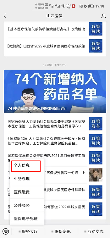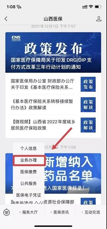 ******步 微信搜索“山西醫(yī)保”公眾號(hào)并關(guān)注,進(jìn)入公眾號(hào)并點(diǎn)擊“服務(wù)大廳”選擇“業(yè)務(wù)辦理”模塊。