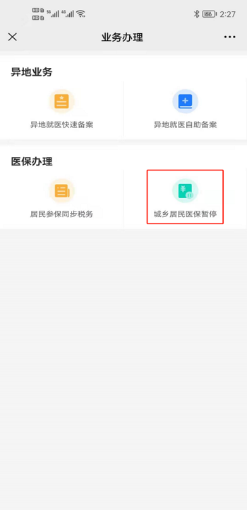 第二步 點(diǎn)擊“業(yè)務(wù)辦理”中右下角的“城鄉(xiāng)居民醫(yī)保暫停”。