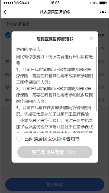 選擇需要操作的城鄉(xiāng)居民基本醫(yī)療保險(xiǎn)項(xiàng)點(diǎn)擊“提交申請(qǐng)”按鈕。