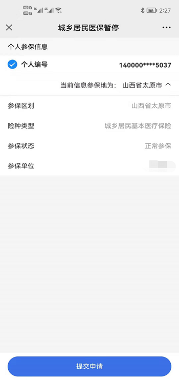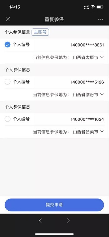 第五步 選擇確認(rèn)主賬戶(hù)參保信息后“提交申請(qǐng)”即可正常辦理醫(yī)保業(yè)務(wù)和享受醫(yī)保待遇。