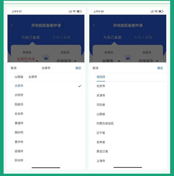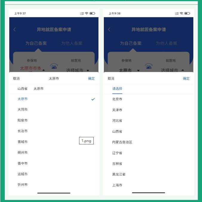 2.參保地選擇“山西省太原市”,就醫(yī)地選擇要去地級市。到北京、天津、上海、重慶、海南、西藏、新疆兵團等地就醫(yī)的,備案到省級即可。