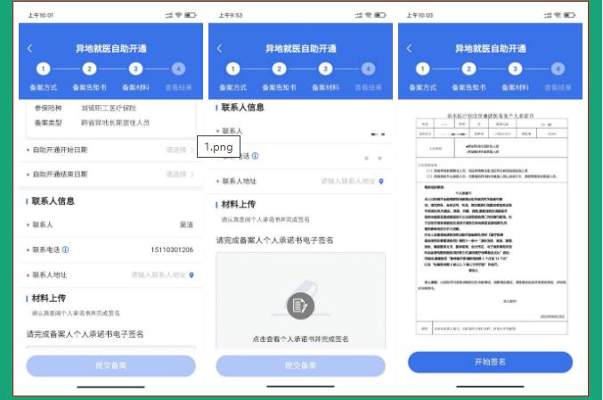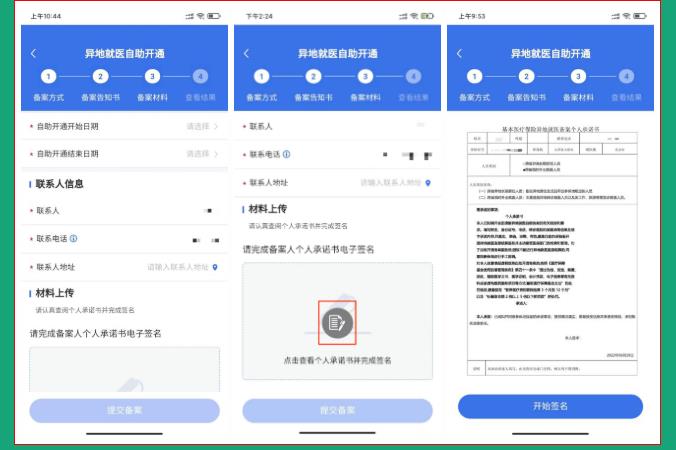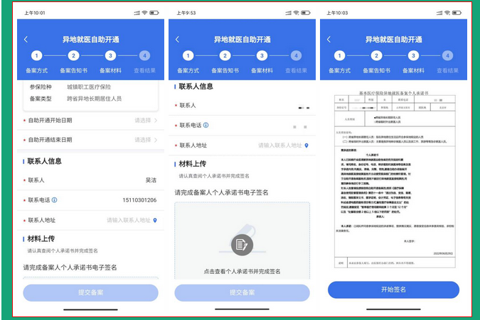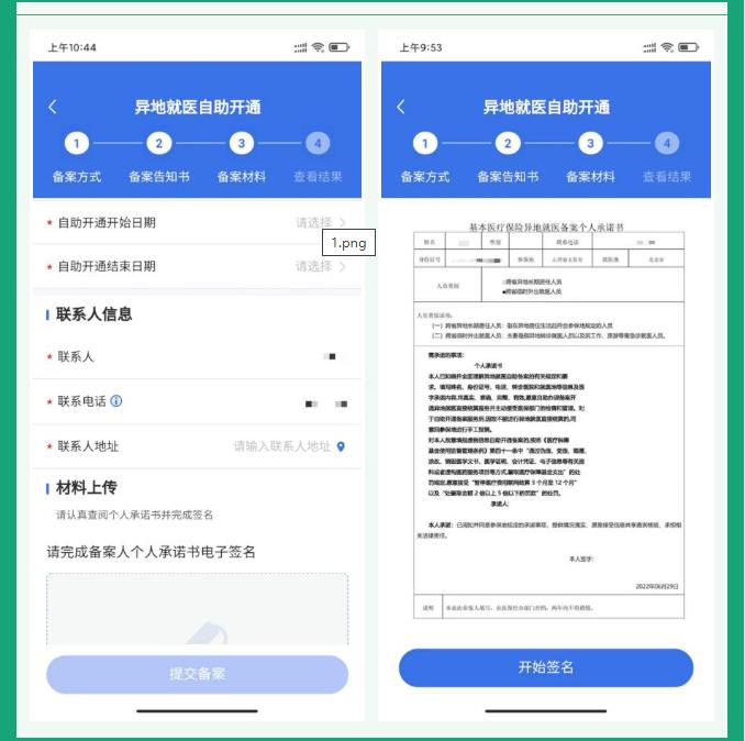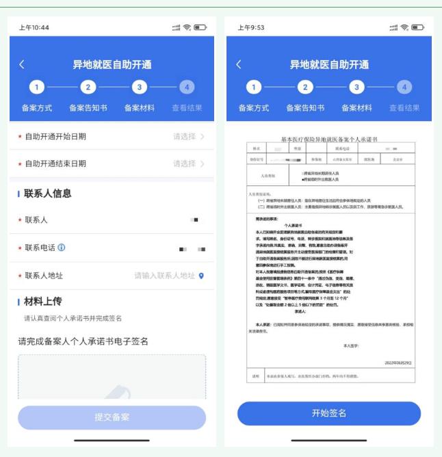 4.選擇“跨省異地長期居住人員”備案的參保人員,填寫“自助開通開始時間”、“自助開通結(jié)束時間”、“聯(lián)系人”、“聯(lián)系電話”、“聯(lián)系人地址”信息后,“點擊查看個人承諾書并完成簽名”→“開始簽名”。