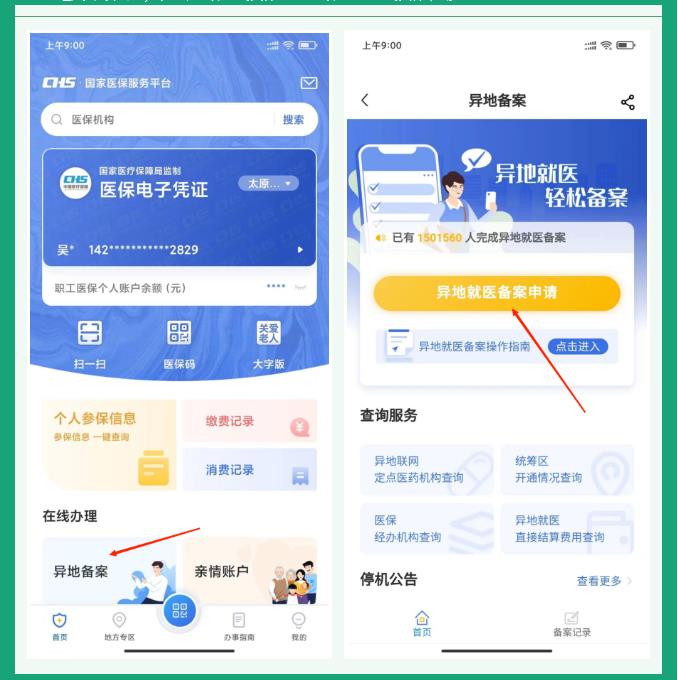 1.登錄成功后,點擊“異地備案”→“異地就醫(yī)備案申請”。
