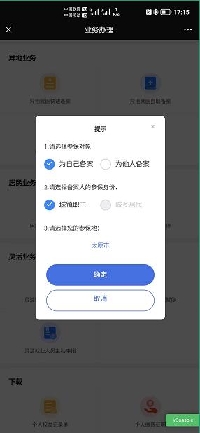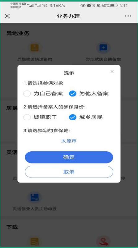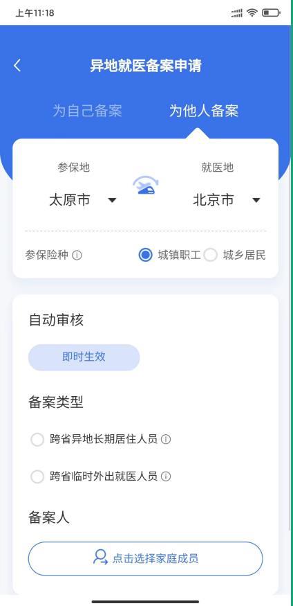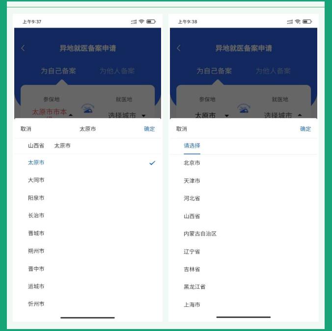 1.選擇“為他人備案”,參保地選擇“山西省太原市”,就醫(yī)地選擇要去地級市。到北京、天津、上海、重慶、海南、西藏、新疆兵團等地就醫(yī)的,備案到省級即可。