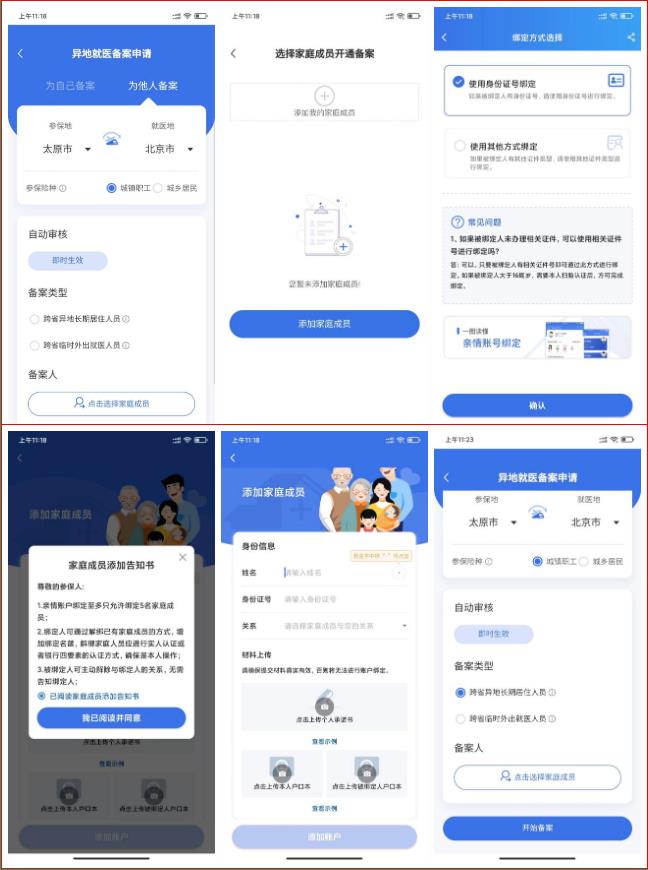 3.“點擊選擇家庭成員”→“添加家庭成員”,進行綁定,認真閱讀“家庭成員添加告知書”,填寫信息,上傳材料,添加賬戶后,點擊“開始備案”。