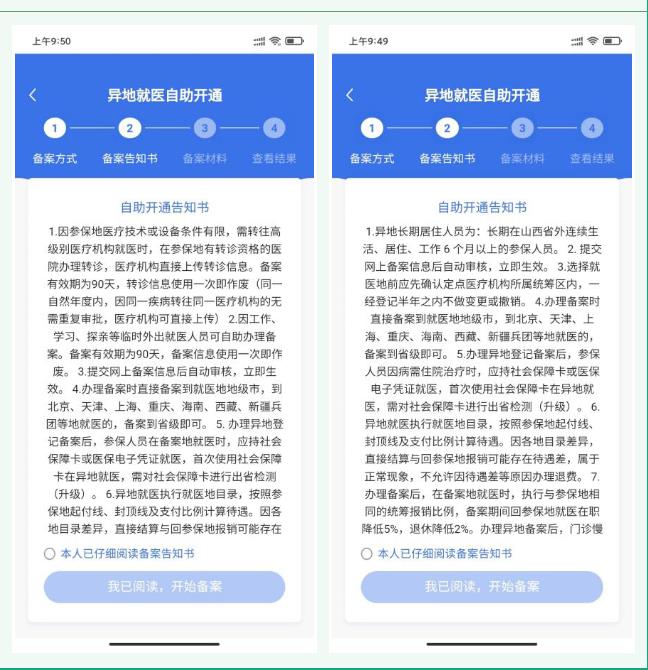4.認真閱讀“自助開通告知書”,選擇“本人已仔細閱讀備案告知書”→“我已閱讀,開始備案”。