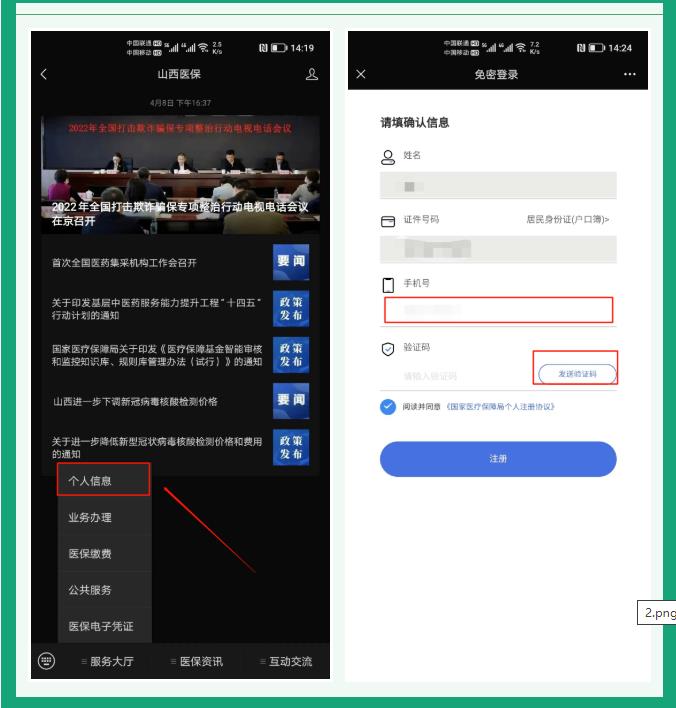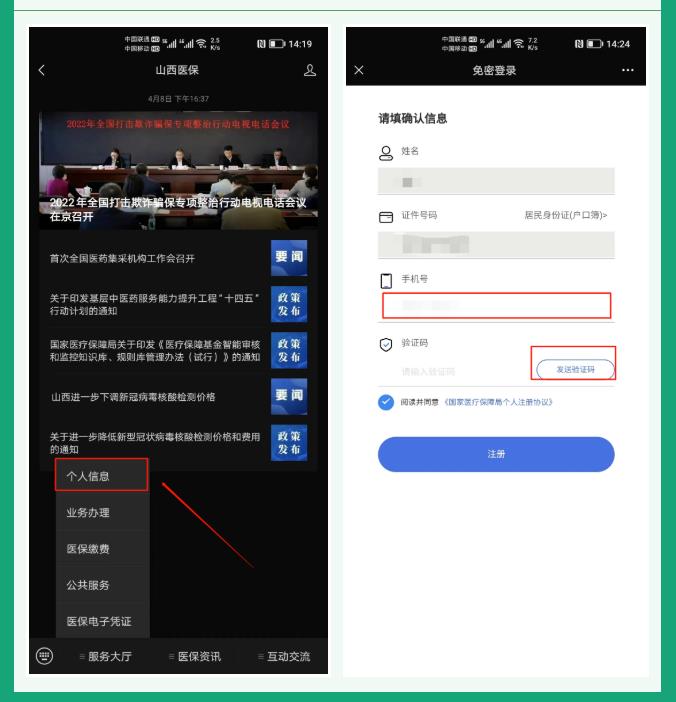 1.微信搜索”山西醫(yī)保”微信公眾號并關(guān)注,進入公眾號首頁找到”服務大廳”,點擊”個人信息”入口,根據(jù)系統(tǒng)提示,填寫手機號獲取驗證碼,完成注冊登錄操作。