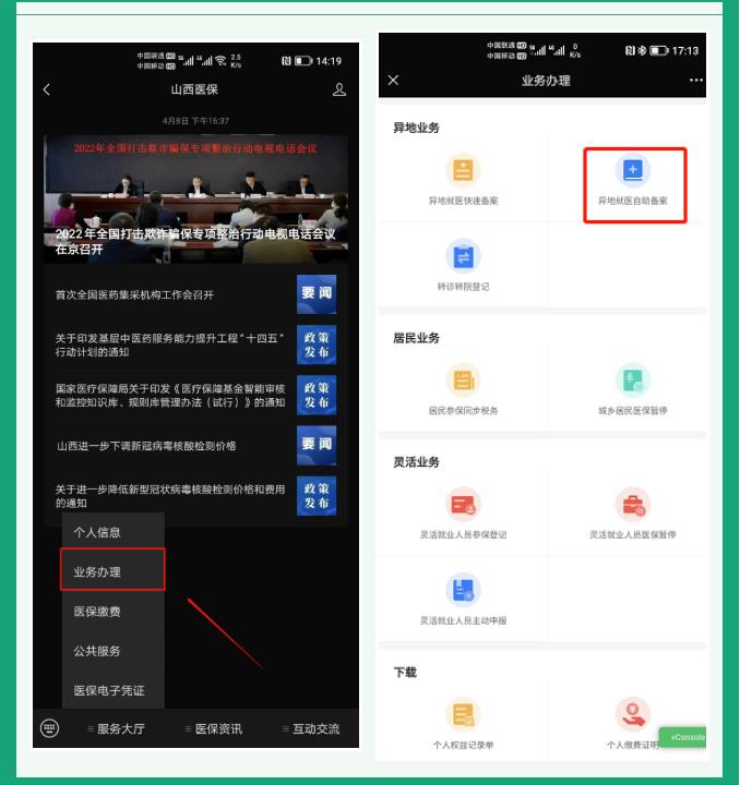 2.返回公眾號首頁,點擊”服務大廳”,選擇”業(yè)務辦理”,進入”異地就醫(yī)自助備案”模塊。