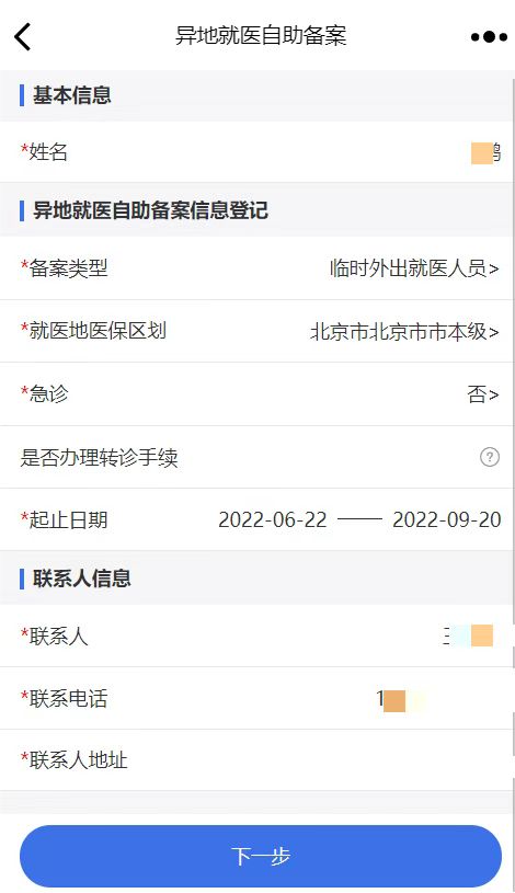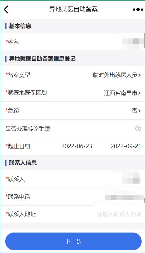 9.依次根據(jù)頁面提示完善異地就醫(yī)自助備案信息(基本信息、異地就醫(yī)自助備案信息登記和聯(lián)系人信息)。