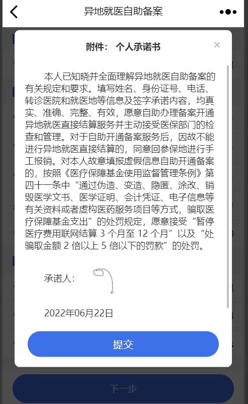 6.點擊”下一步”,閱讀個人承諾書并且在承諾書上簽字,然后提交。