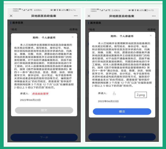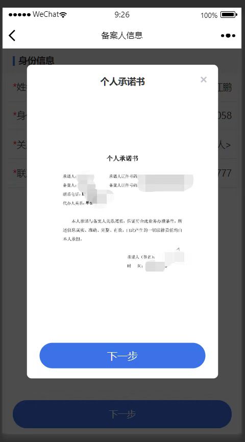 7.簽字后,頁面生成代辦《個人承諾書》,確認后點擊”下一步”(長按可進行本地保存)。
