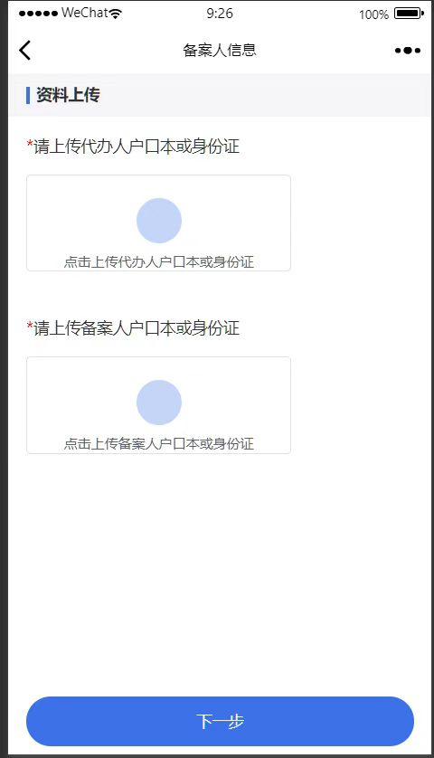 8.完善代辦人信息的資料上傳(上傳代辦人戶口本或身份證和備案人戶口本或身份證)。
