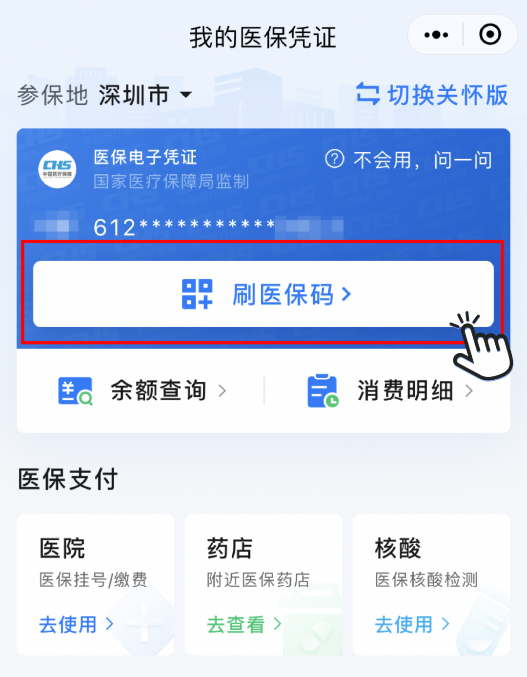 完成了前兩步之后,就可以去醫(yī)院看病了。社??ㄈ绻鼛砩弦矝](méi)關(guān)系,可以直接用手機(jī)上的電子社??ɑ蛘叱鍪踞t(yī)保碼,都可以刷醫(yī)保。