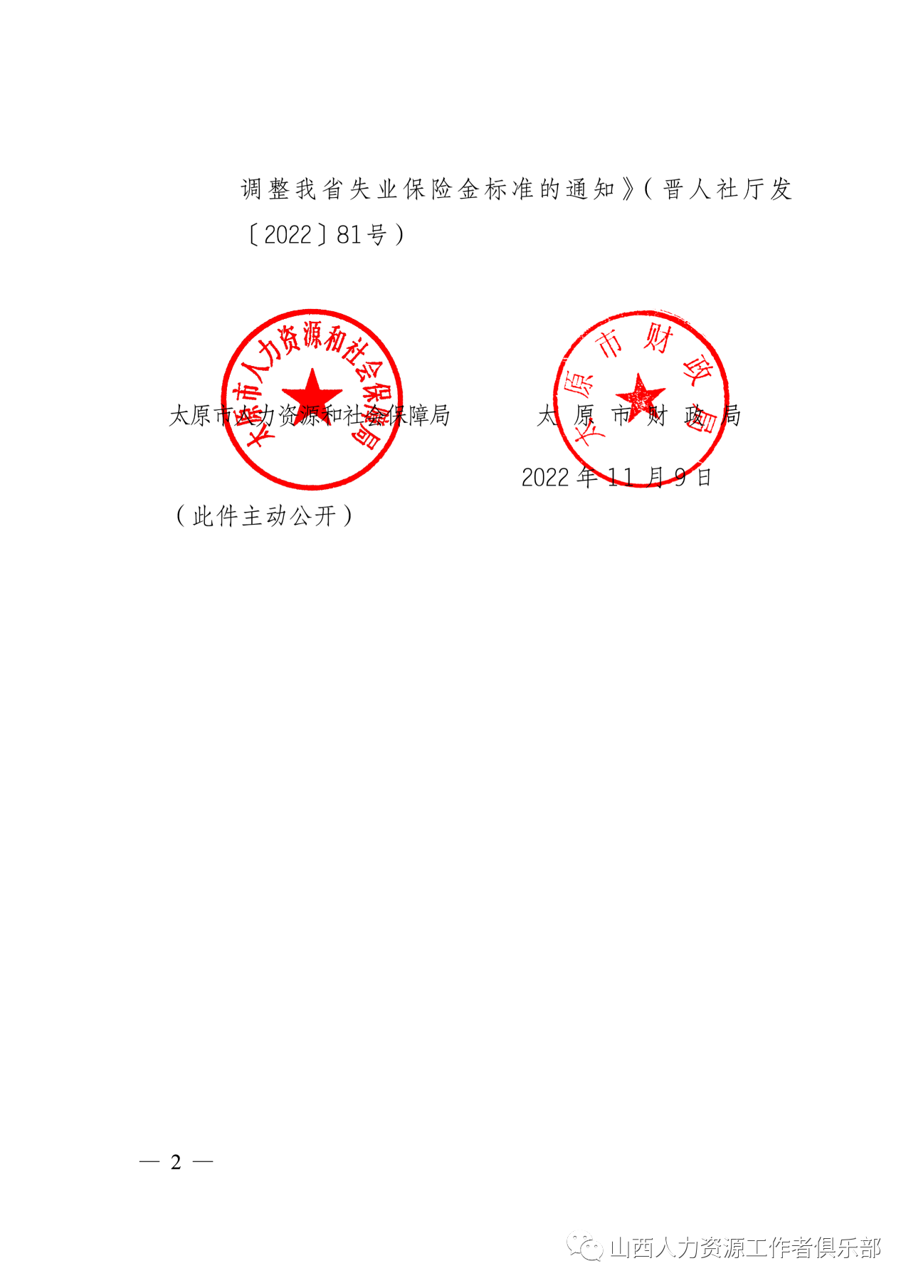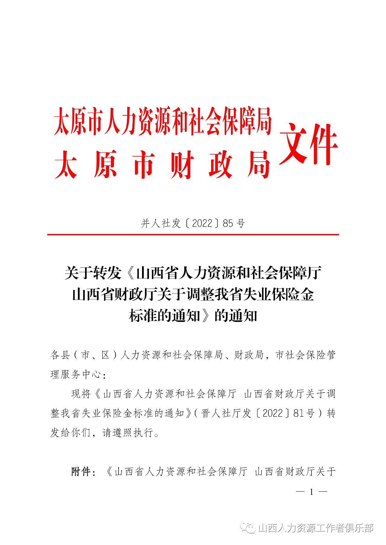 現(xiàn)將《山西省人力資源和社會保障廳 山西省財(cái)政廳關(guān)于調(diào)整我省失業(yè)保險(xiǎn)金標(biāo)準(zhǔn)的通知》(晉人社廳發(fā)〔2022〕81號)轉(zhuǎn)發(fā)給你們,請遵照執(zhí)行。