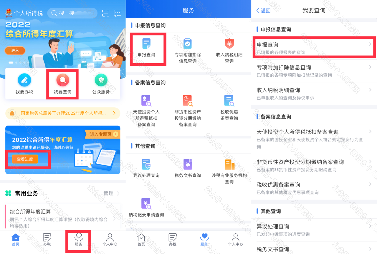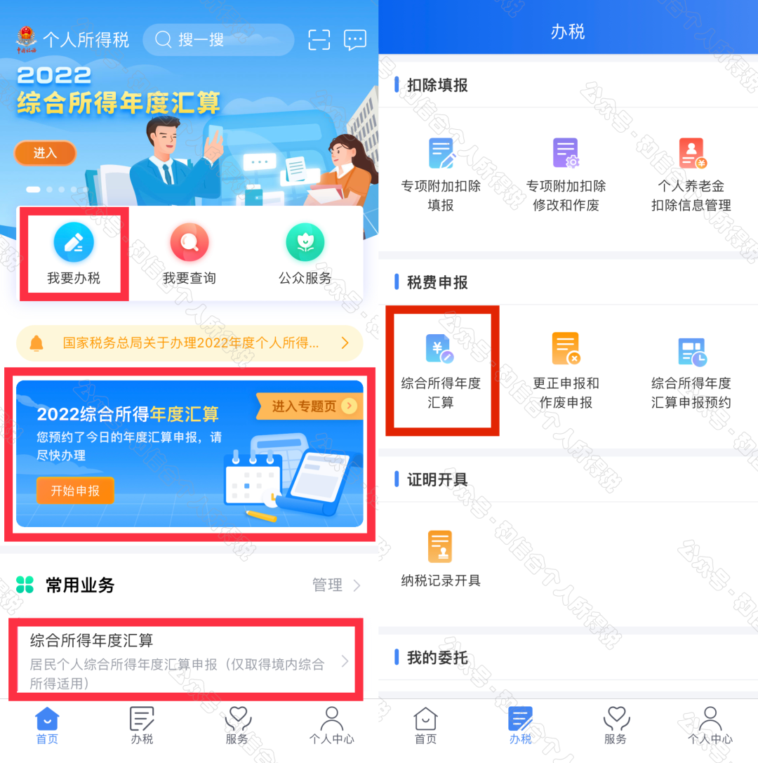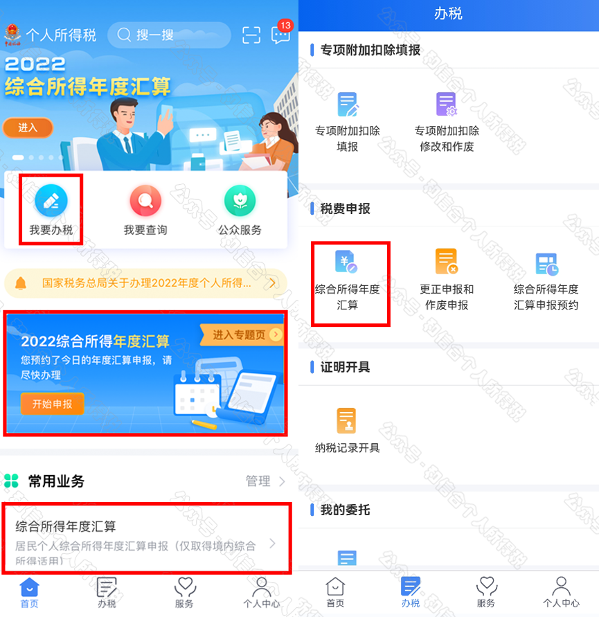 一是從首頁(yè)中間部位【2022綜合所得年度匯算】-【開(kāi)始申報(bào)】進(jìn)入;