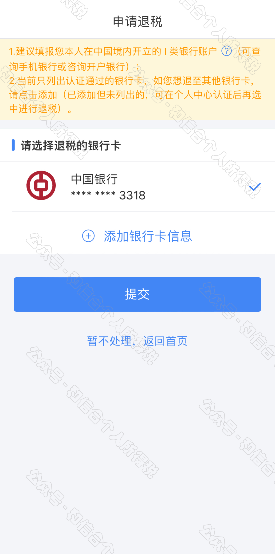 如果您的銀行卡不在身邊,或者暫時(shí)不想退稅,可以點(diǎn)擊【暫不處理,返回首頁(yè)】,后續(xù)可再次發(fā)起退稅申請(qǐng)。