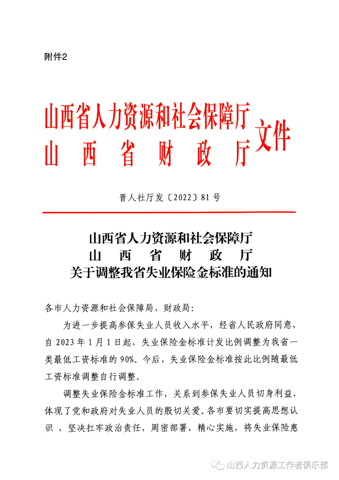 《山西省人力資源和社會保障廳 山西省財政廳關(guān)于調(diào)整我省失業(yè)保險金標準的通知》(晉人社廳發(fā)〔2022〕81號)