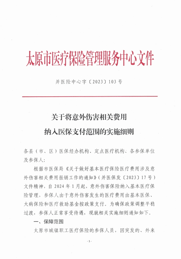 太原市城鎮(zhèn)職工醫(yī)療保險的參保人員,因突發(fā)的、外來的、非疾病的客觀事件導致意外傷害,在定點醫(yī)療機構發(fā)生的醫(yī)療費用,納入醫(yī)療保險保障范圍。